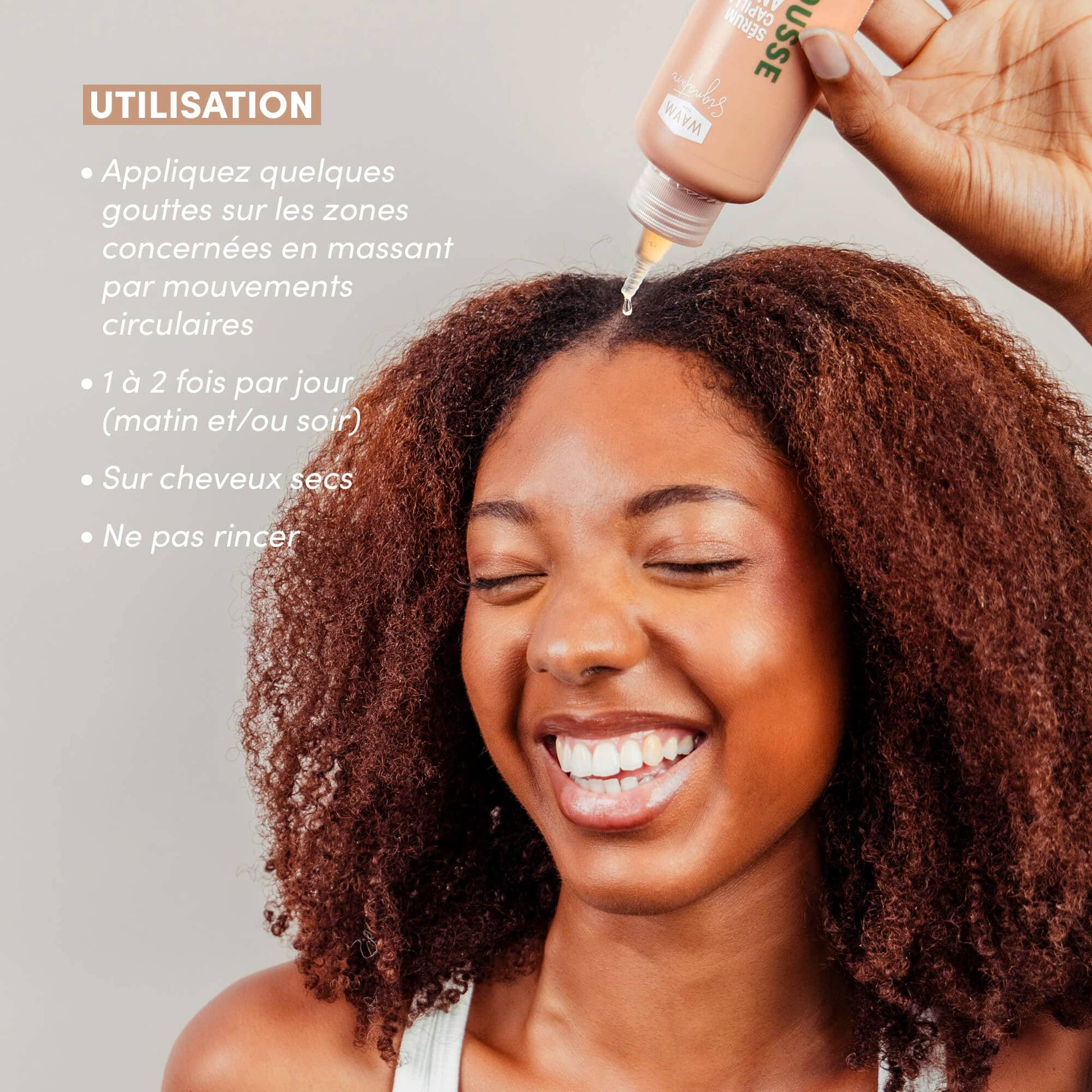 Appliquer le Sérum au niveau du cuir chevelu sur cheveux secs chaque jour, 1 à 2 fois par jour (matin et/ou soir). Appliquer quelques gouttes sur les zones concernées en massant par mouvements circulaires votre cuir chevelu. Ce sérum n’a pas besoin d’être rincé.